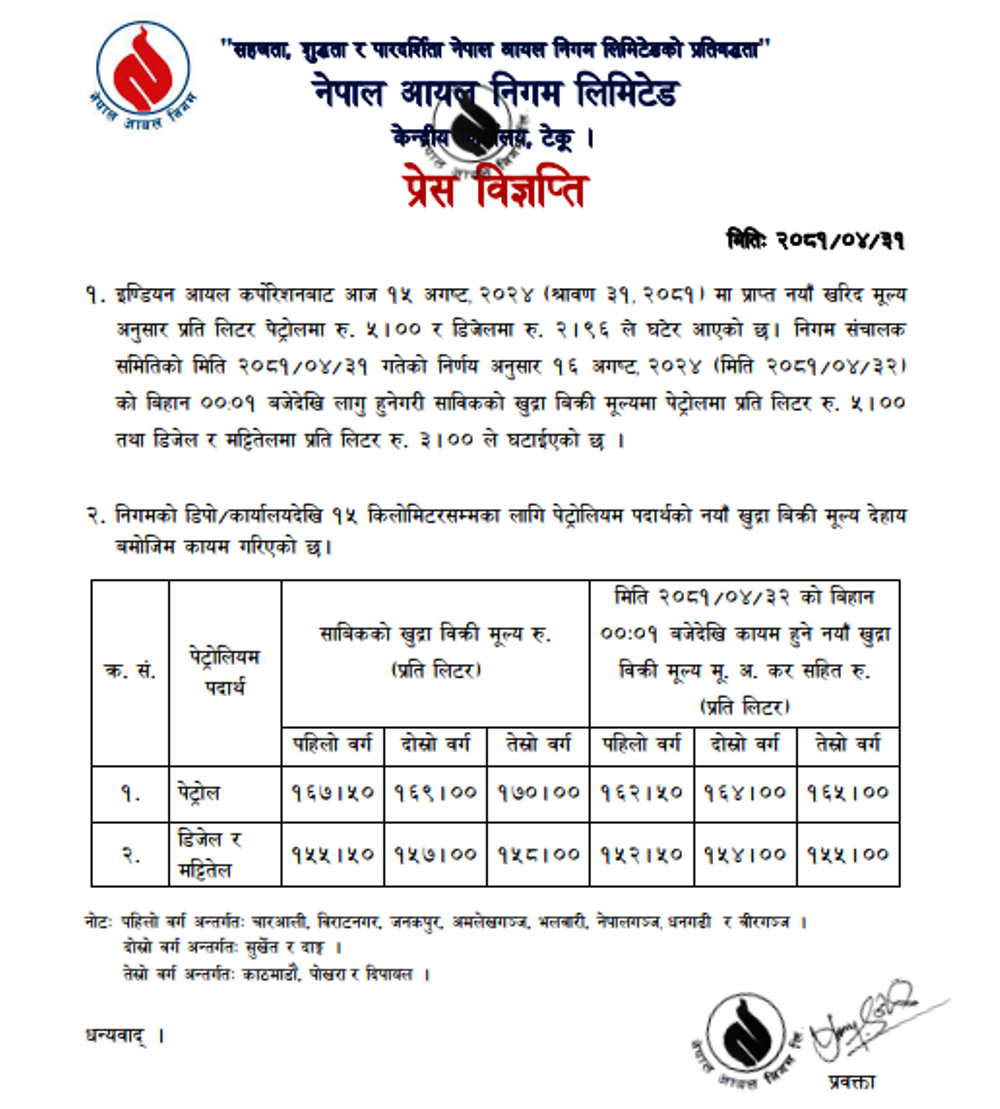 घटेको मूल्य अनुसार चारआली, विराटनगर, जनकपुर, अमलेखगञ्ज, भलबारी, नेपालगञ्ज, धनगढी र वीरगञ्ज क्षेत्रमा पेट्रोल प्रतिलिटर १६२, डिजेल र मट्टीतेल १५२ रुपैयाँ कायम भएको छ । त्यस्तै सुर्खेत र दाङ क्षेत्रमा पेट्रोल प्रतिलिटर १६४, डिजेल तथा मट्टीतेल १५४ रुपैयाँ कायम भएको छ ।