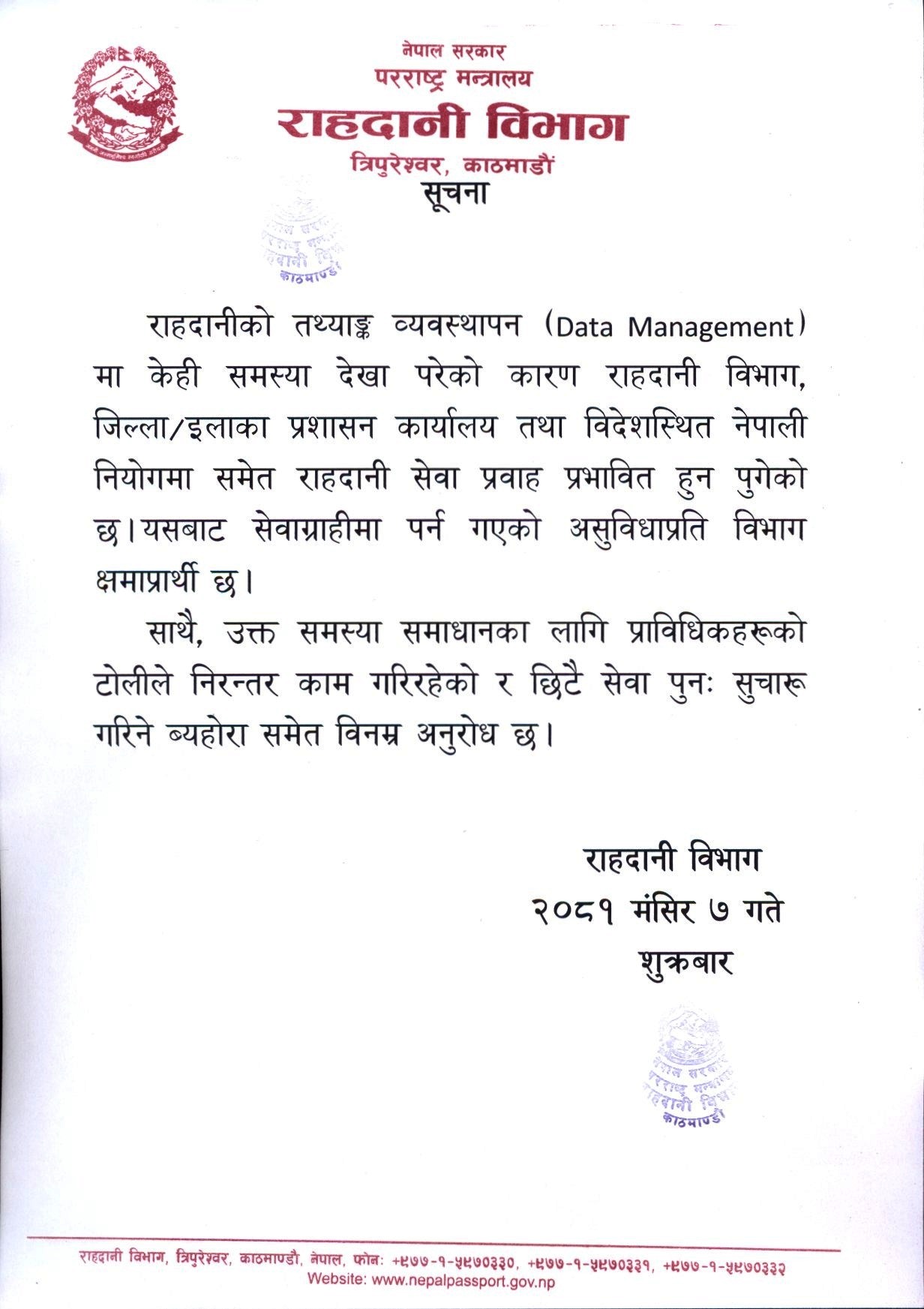 समस्या निम्तिएपछि नयाँ राहदानी बनाउने, पुरानो राहदानी नवीकरण गर्नेलगायत राहदानीसम्बन्धी सबै काम अवरुद्ध हुन पुगेको बताइएको छ ।