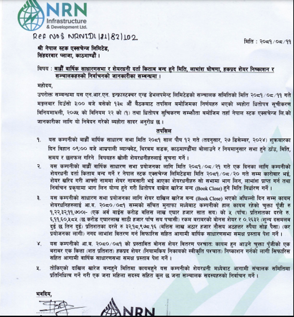 कम्पनीले उक्त लाभांश वितरण पश्चात कायम हुने चुक्ता पुँजीको शतप्रतिशत हकप्रद निष्काशन गर्ने प्रस्तावसहित बाह्रौं वार्षिक साधारणसभा आह्वान गरेको छ । कम्पनीले लाभांश तथा साधारणसभा प्रयोजनका लागि मंसिर २१ गतेका लागि बुक क्लोज गर्ने निर्णय गरेको छ । सोहीकारण नेपाल स्टक एक्सचेन्ज लिमिटेडमा मंसिर २० गतेसम्म कारोबार भई शेयर खरिद गरी आफ्नो नाममा शेयर नामसारी भई आएका शेयरधनीहरु सभामा भाग लिन, लाभांश प्राप्त गर्न तथा निर्वाचन प्रकृयामा भाग लिन सक्नेछन् ।