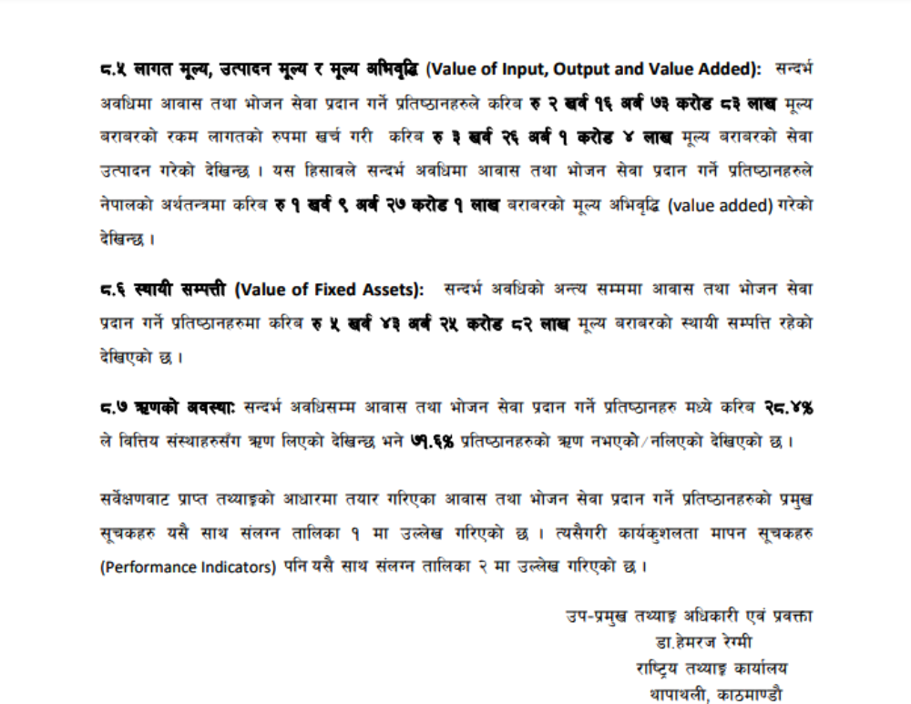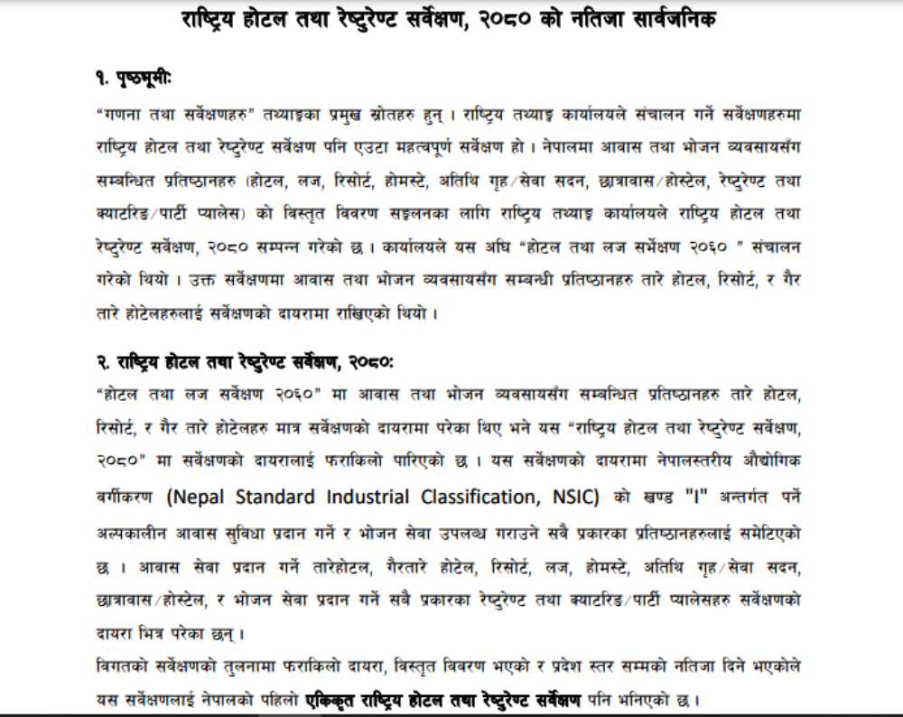 कार्यालयले बुधबार सार्वजनिक गरेको तथ्याँकले यो विवरण देखाएको हो । कार्यालयले राष्ट्रिय होटेल तथा रेस्टुरेन्ट सर्वेक्षण–२०८० सार्वजनिक गरेको हो । २०७९ साउनदेखि २०८० मसान्तसम्मको आर्थिक वर्ष २०७९–८० मा सो सर्वेक्षण गरिएको थियो ।