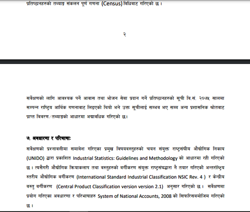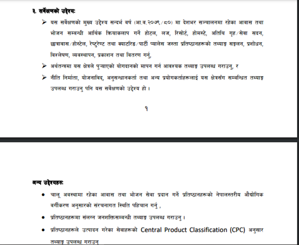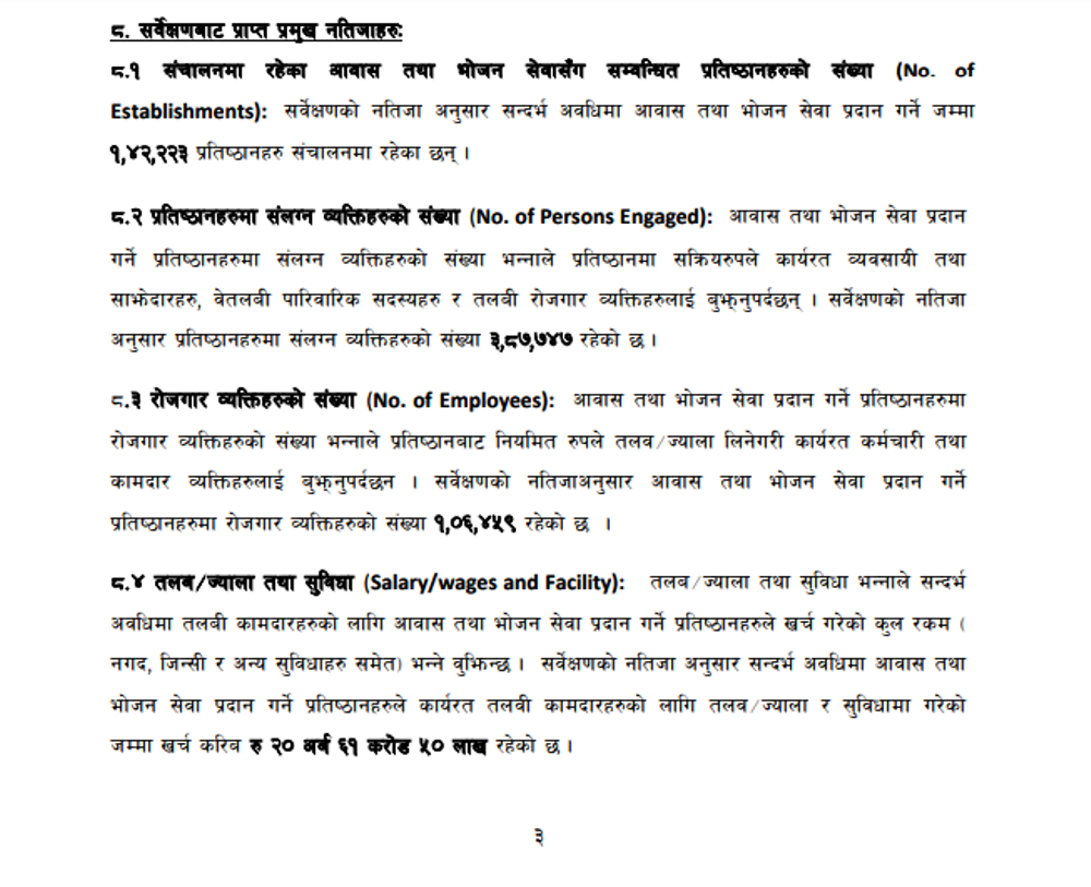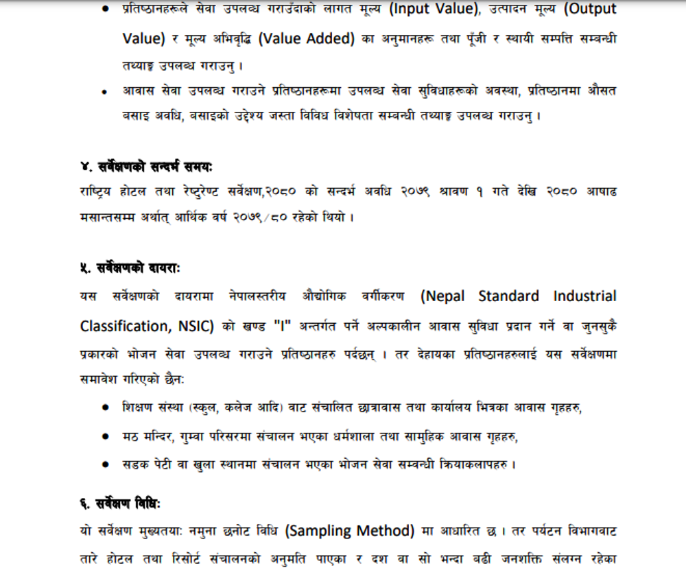 सर्वेक्षणमा आवास तथा भोजन व्यवसायसँग सम्बन्धित तारे होटेल, रिसोर्ट, गैर तारे होटेल होमस्टेको अवस्थाको अध्ययन गरिएको सवैमा उल्लेख छ ।