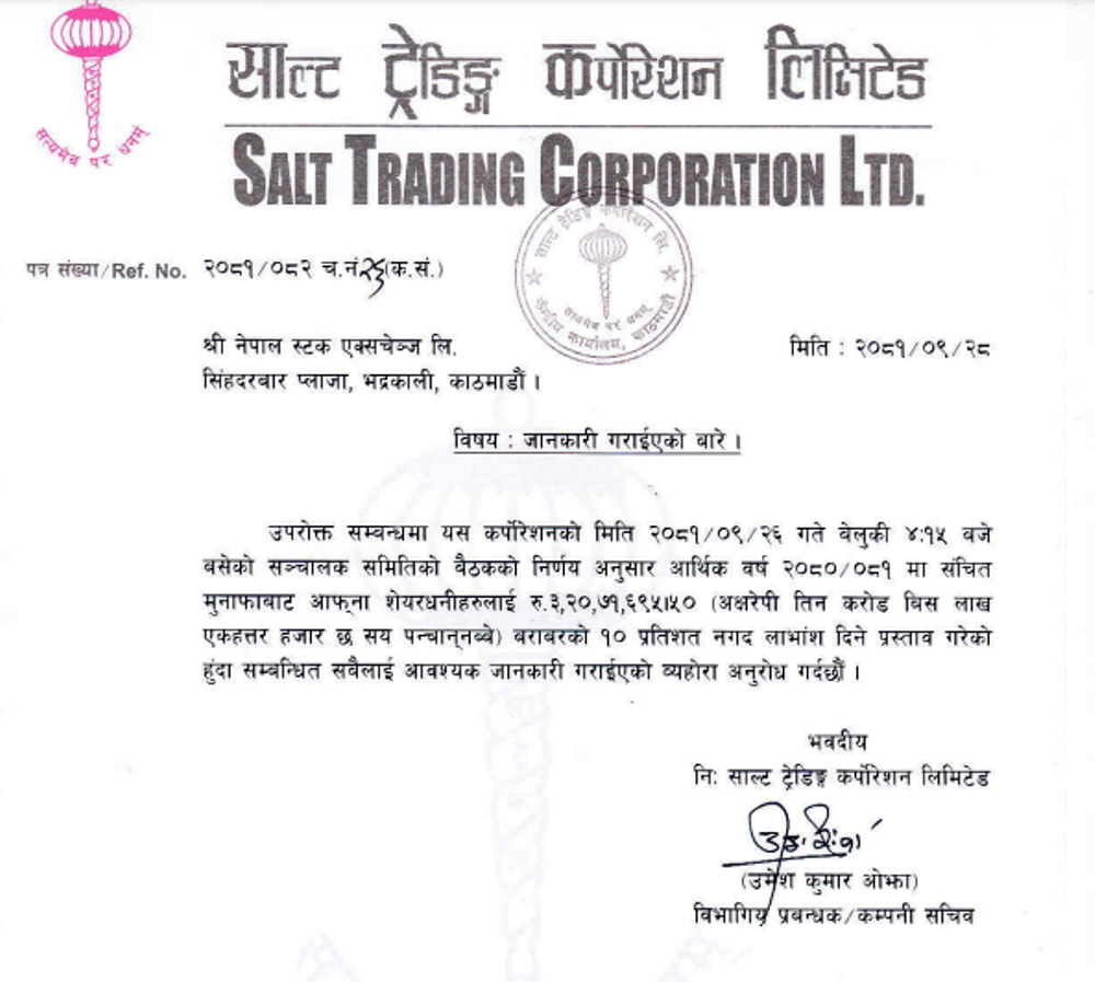 काठमाडौं । साल्ट ट्रेडिङ्ग कर्पोरेशन लिमिटेडले शेयरधनीलाई दिने लाभांश घोषणा गरेको छ ।