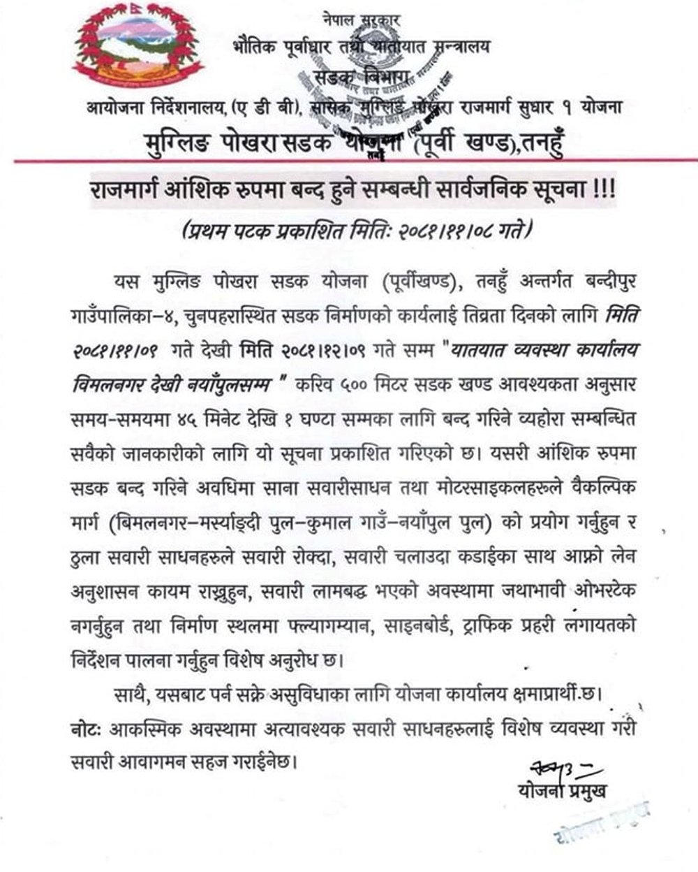 यसअनुसार विमलनगर बजारदेखि नयाँ पुलसम्म करिब ५०० मिटर सडक खण्ड शुक्रबारबाट एक महिनासम्म आंशिक रूपमा बन्द गरिनेछ । चैत ९ गतेसम्म आवश्यकता अनुसार समय–समयमा ४५ मिनेट देखि १ घण्टा सम्मका लागि उक्त खण्ड बन्द गरिने मुग्लिङ–पोखरा सडक योजनाको पूर्वी खण्डले एक सूचनामार्फत जानकारी दिएको छ ।