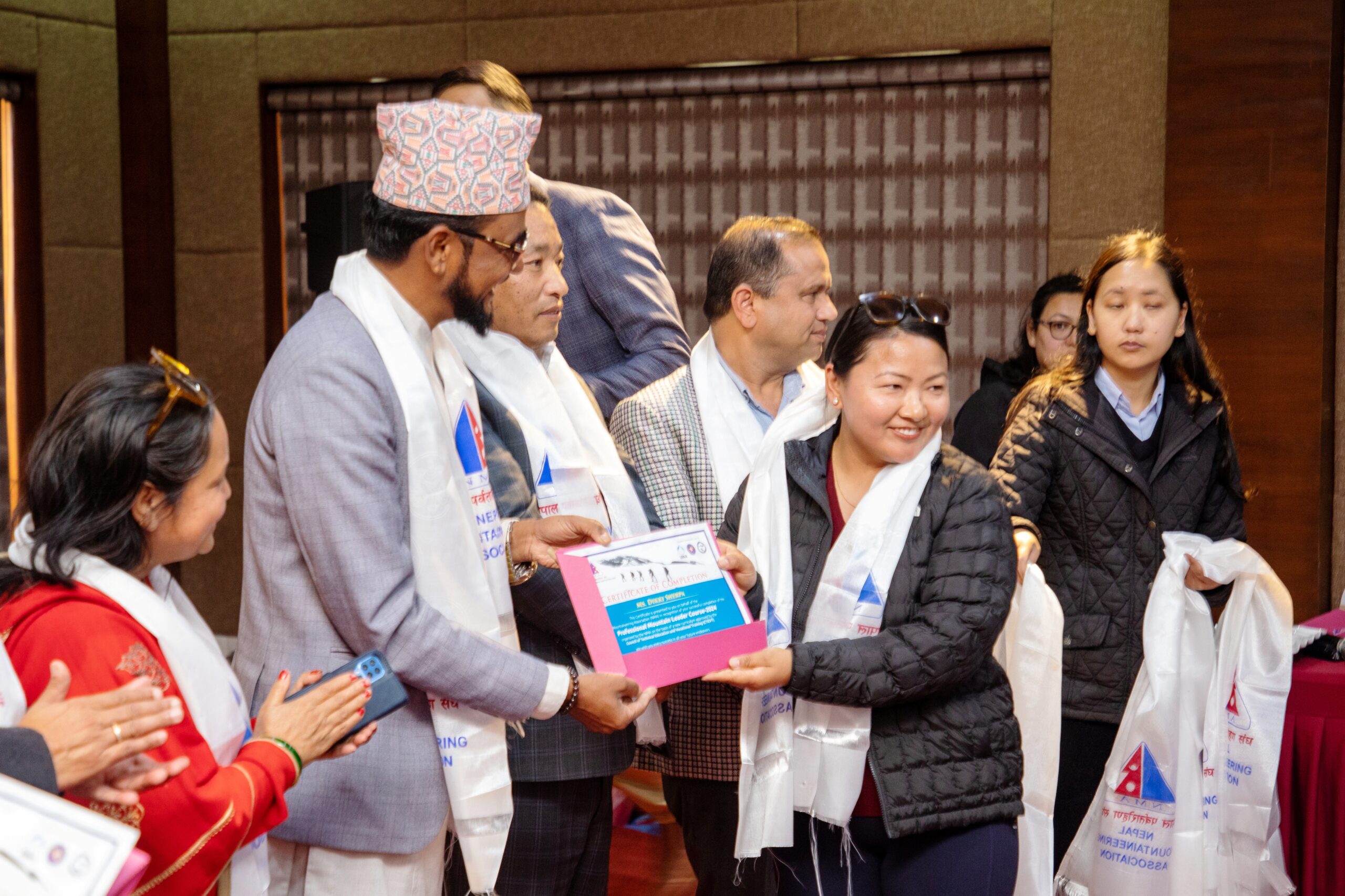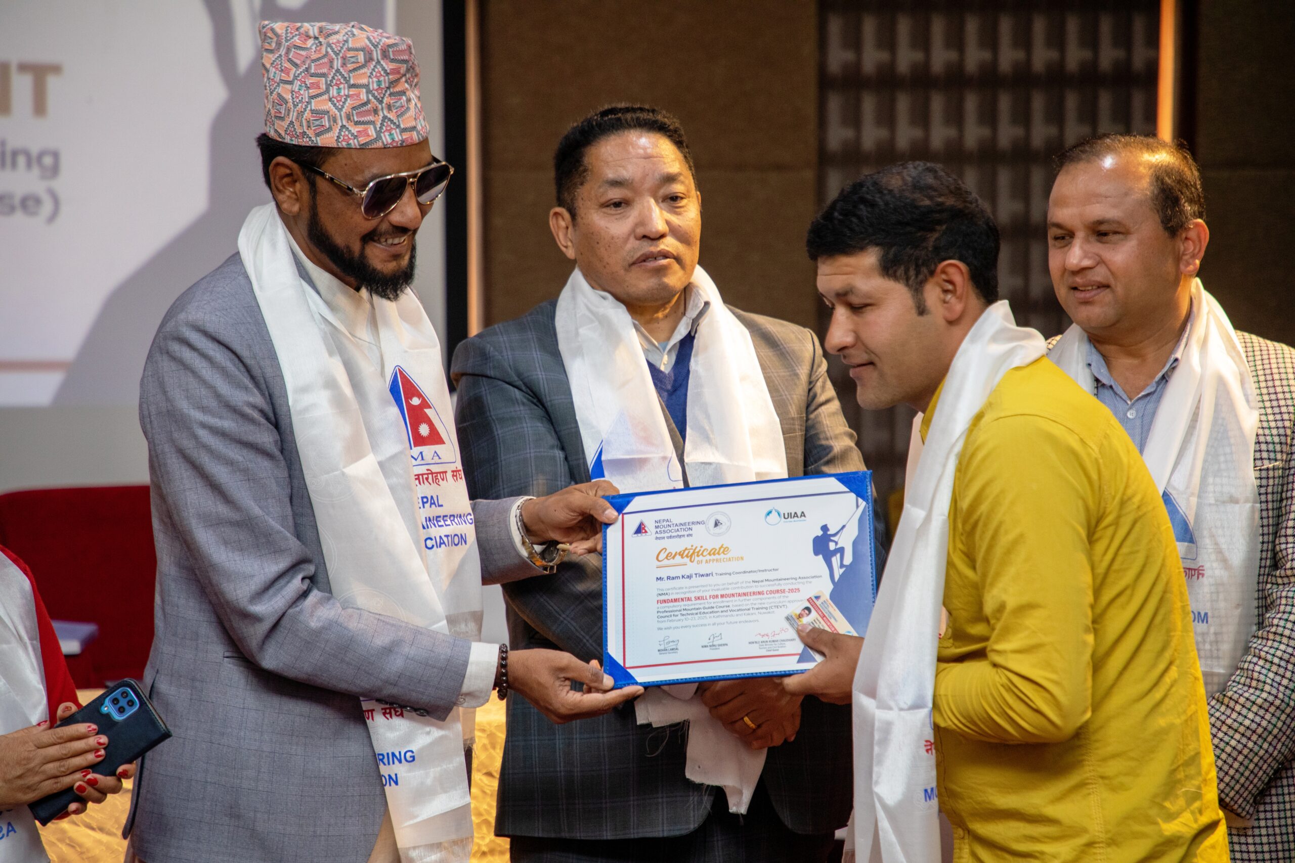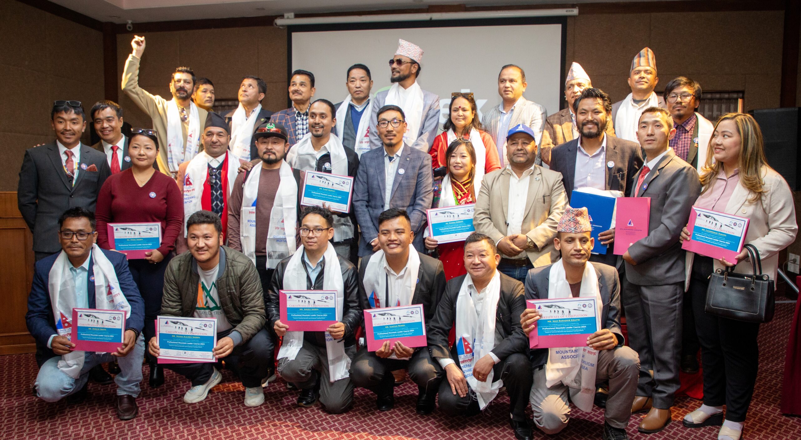 The NMA has distributed certificates to all participants who successfully completed the Professional Mountain Leader training (including Fundamental Skill, Summer Skill, Winter Skill, 80 hours of Mountain Medicine, and High Altitude Skill) and the Fundamental Skill for Mountaineering course. To date, 32 participants have successfully completed the Professional Mountain Leader Training, and 21 participants have successfully completed the Fundamental Skill for Mountaineering course, a compulsory requirement of Professional Mountain Guide Training as part of the new curriculum approved by CTEVT.