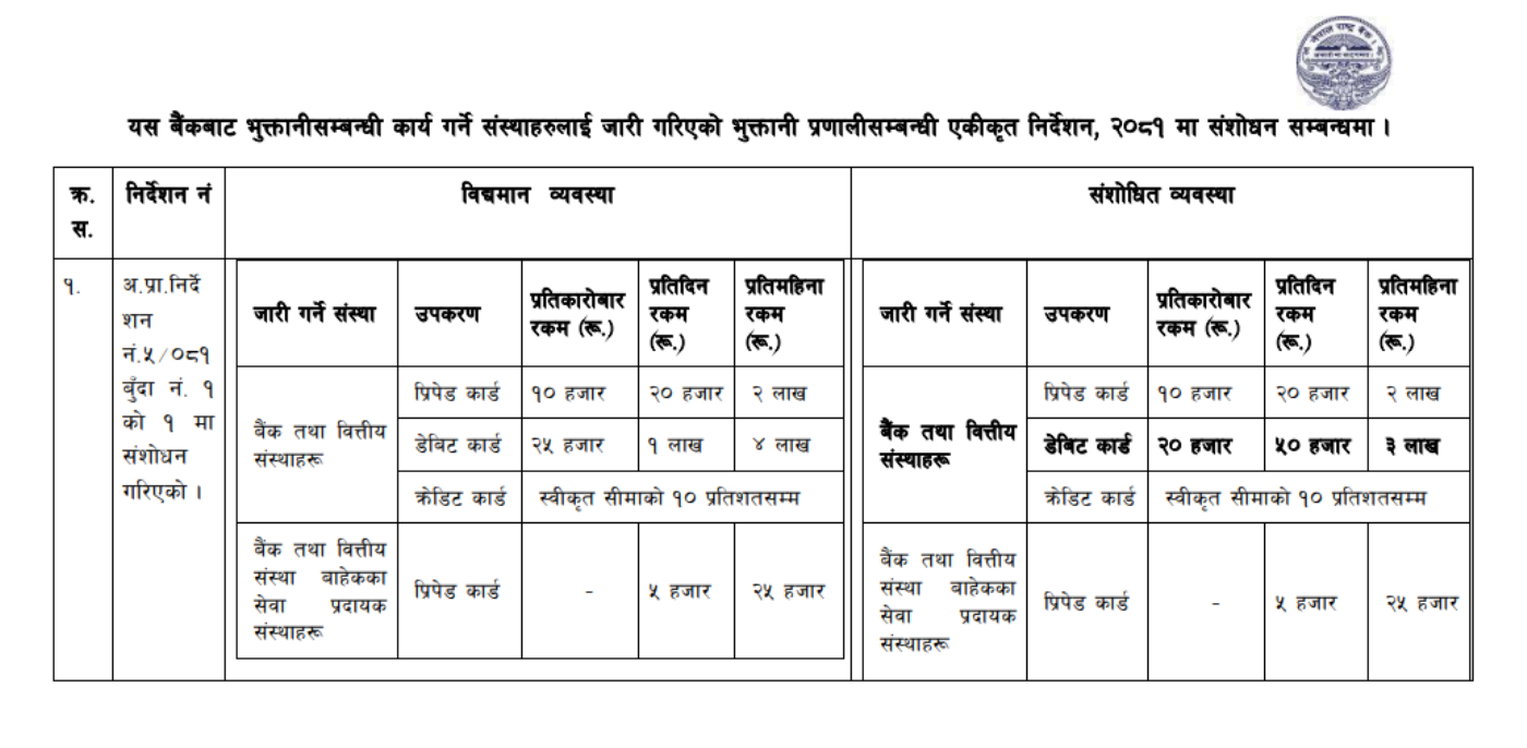 नयाँ सर्कुलर अनुसार अब डेबिट कार्डबाट प्रति कारोबार २० हजार रुपैयाँ निकाल्न मिल्नेछ । यसअघिको व्यवस्थाअनुसार प्रति कारोबार २५ हजार रुपैयाँ निकाल्न सकिन्थ्यो । त्यस्तै मासिक ३ लाख रुपैयाँसम्म कारोबार गर्न सकिनेछ । यसअघि प्रतिमहिना ४ लाख रुपैयाँसम्म रकम झिक्न सकिने व्यवस्था रहेको थियो ।