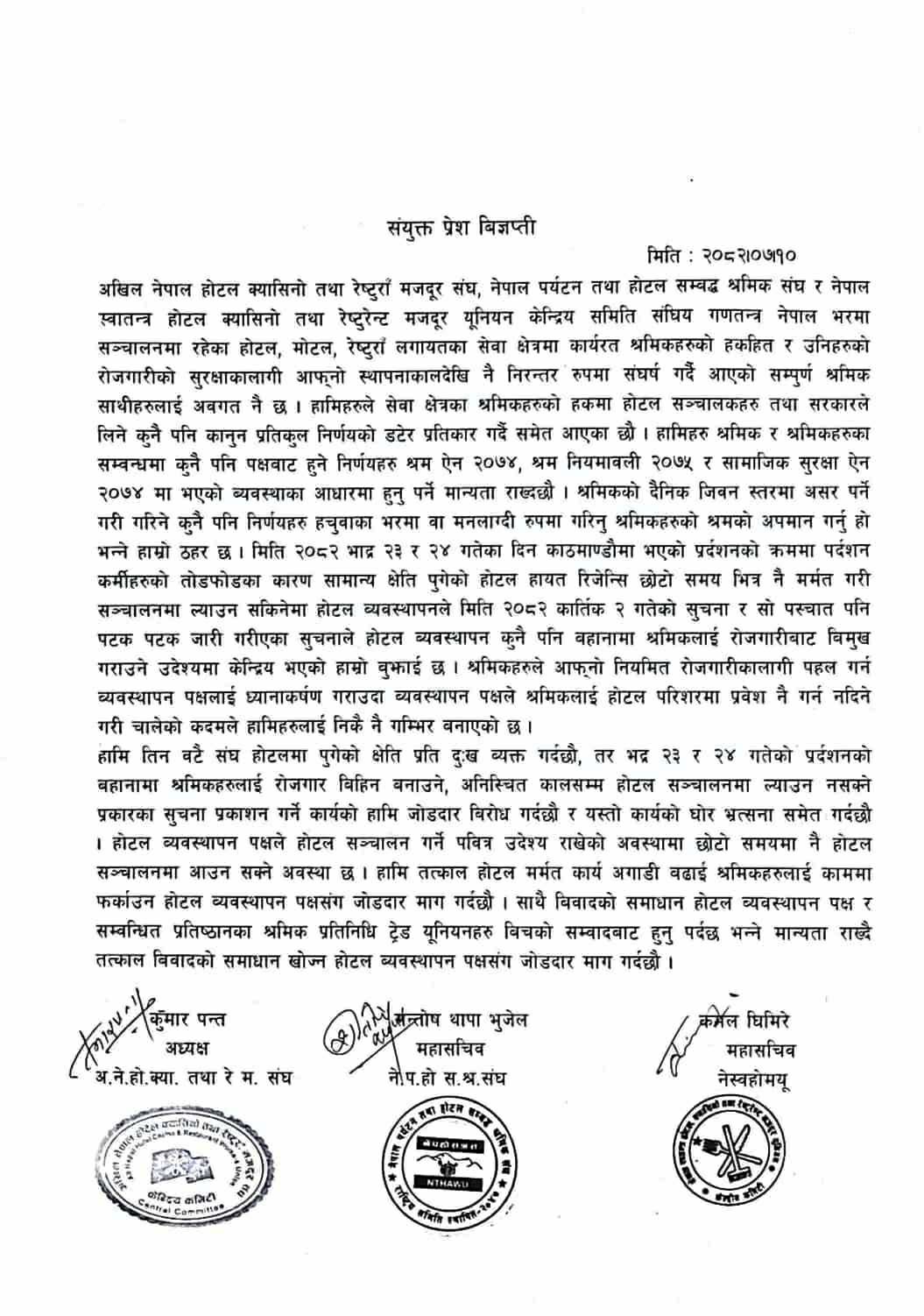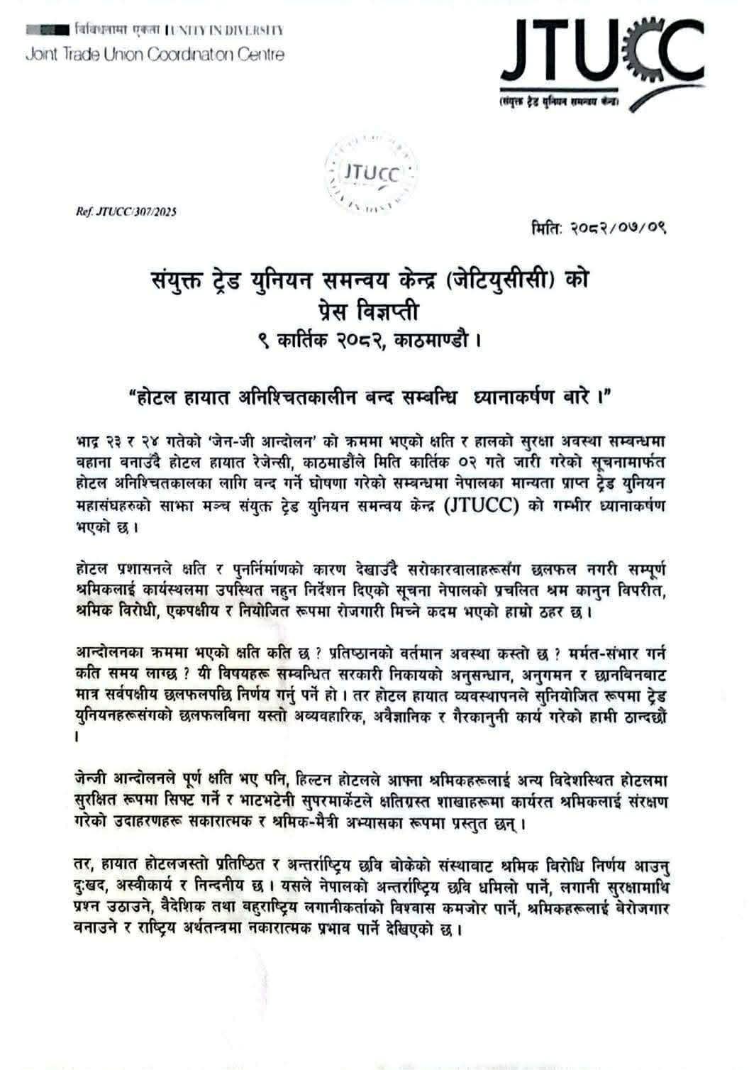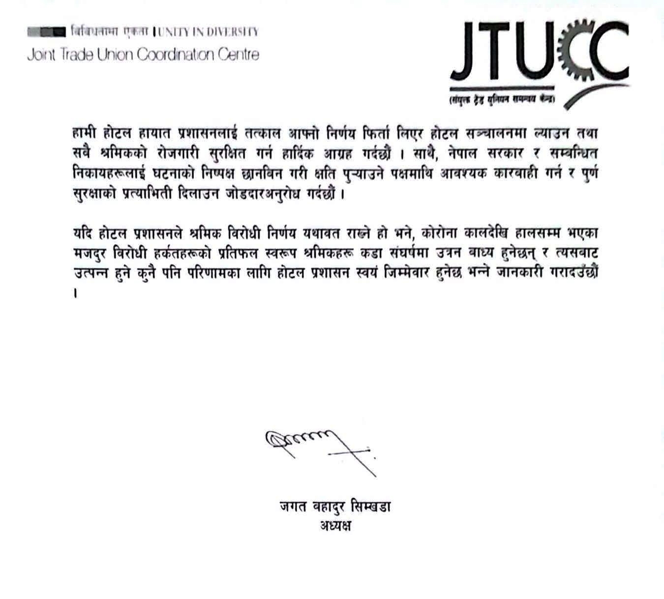 होटलका श्रमिक संगठनहरुलाई उनीहरुका केन्द्रका श्रमिक संगठन र जेटियुसीसीले पनि समर्थन गरेको छ । हेर्नुस् यस्तो छ विज्ञप्ति