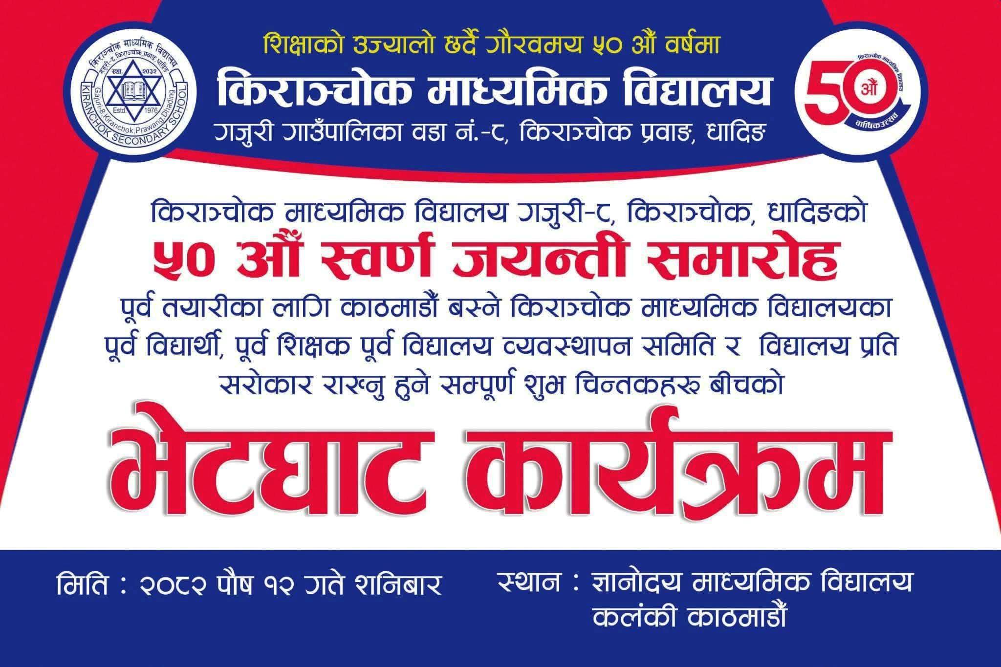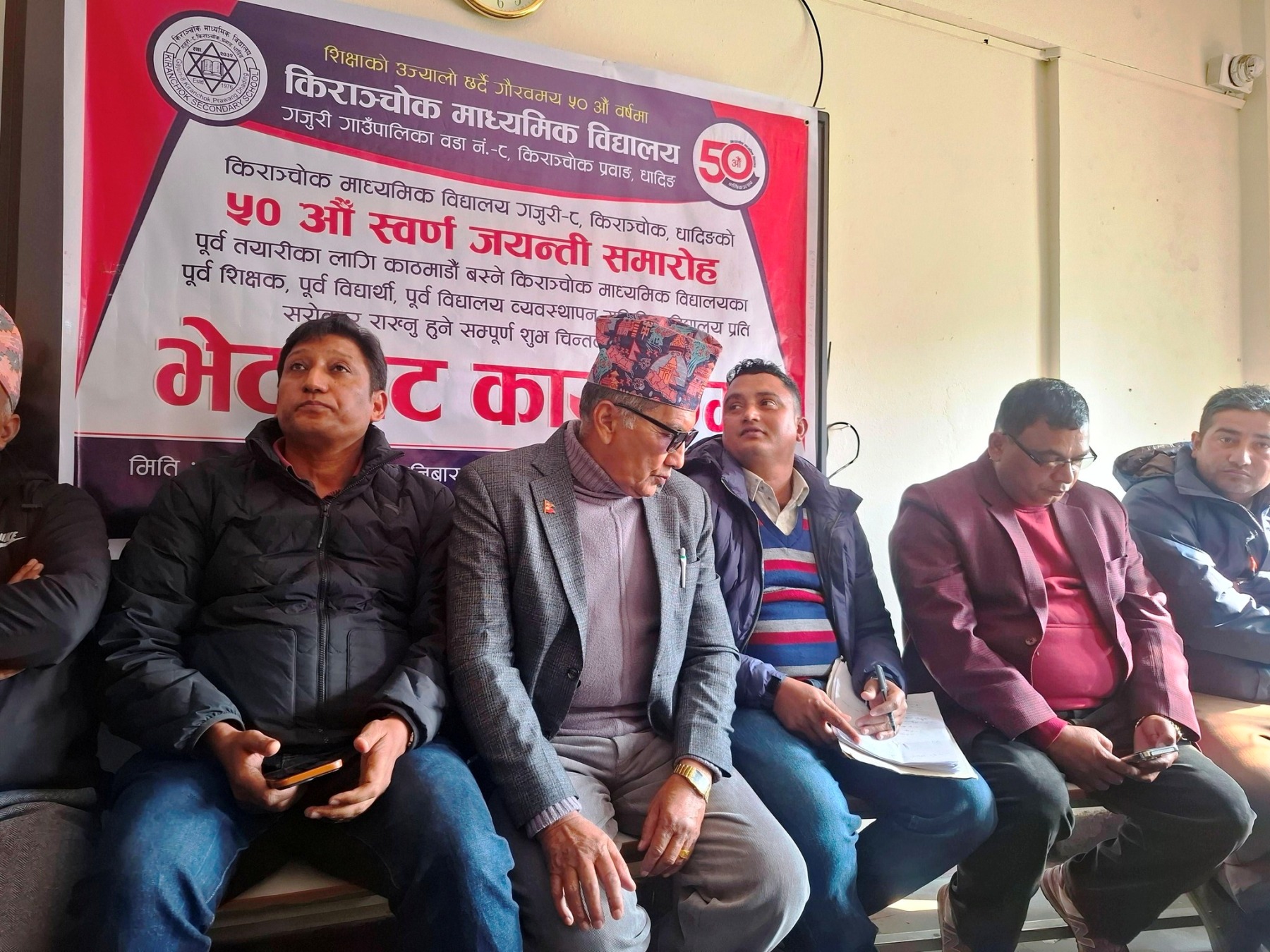काठमाडौं । तियारीको चौताराबाट सुरु भइ वि.सं. २०३२ सालमा दर्ता भएर सञ्चालित श्री किराञ्चोक माध्यामिक विद्यालय, गजुरी–८, किराञ्चोक (प्रवाङ), धादिङले यही माघ १५, १६ र १७ गते आफ्नो स्थापनाको पचास वर्ष पुगेको अवसरमा स्वर्णजयन्ती मनाउने भएको छ । स्वर्णजयन्ती मनाउनेक्रममा विभिन्न तयारी थालिएको छ । यसैक्रममा पुस १२ गते शनिबार ज्ञानोदय माध्यामिक विद्यालय, बाफल काठमाडौंमा स्वर्णजयन्ती भव्यरुपले सम्पन्न गर्ने विषयमा पूर्व विद्यार्थी, शिक्षक, व्यवस्थापन समिति, एवं त्यहाँ अध्ययन गरेर विभिन्न क्षेत्रमा रहेका प्रतिष्ठित व्यक्तित्वहरुबीच छलफल भइ विभिन्न उपसमिति समेत गठन गरिएको छ । किराञ्चोक मावि विद्यालय व्यवस्थापन समितिका अध्यक्ष राजकुमार ढुंगानाको अध्यक्षता र गजुरी गाउँपालिका वडा नं. ८ का वडा अध्यक्ष देवराज ओझाको प्रमुख आतित्थतामा कार्यक्रम सम्पन्न गरिएको हो । पूर्व तयारी छलफलमा संस्थापक प्रअ गोविन्द भण्डारी, पूर्व विद्यार्थी एवं शिक्षक तथा नेपाल शैक्षिक परामर्श व्यवसायी महासंघका अध्यक्ष राजेन्द्र बराल, पूर्व विद्यार्थी एवं बेलकोटगढी नगरपालिका–३, नुवाकोटकी वडाअध्यक्ष कौशिला पुडाशैनीसहित विभिन्न क्षेत्रमा उच्च पद हाशिल भएका दुई दर्जन बढीको उपस्थिति रहेको थियो ।