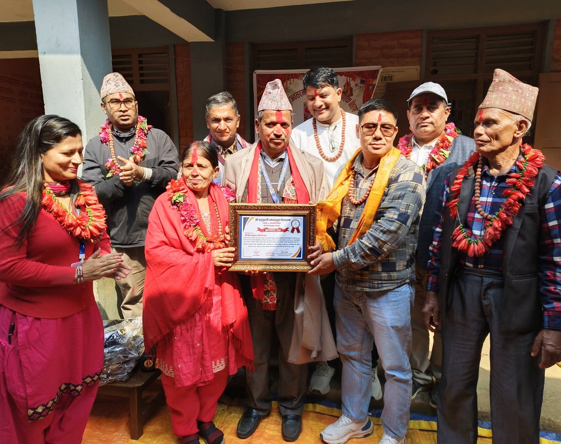 कार्यक्रमको अवसरमा सामाजिक कार्य गर्ने विद्यालयका प्रधानाध्यापक शिव प्रसाद न्यौपानेलाई गाउँपालिकाका अध्यक्ष श्रेष्ठले दोसल्ला र कदरपत्रले सम्मान गरेका थिए ।